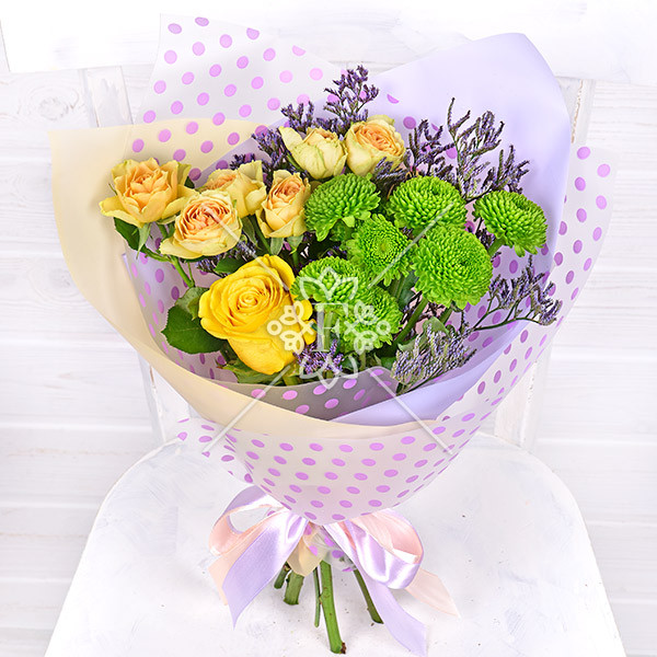 Роза желтая- 1 шт., роза желтая кустовая – 1 шт., хризантема кустовая зеленая – 1 шт., лимониум фиолетовый – 1 шт., упаковка, лента.